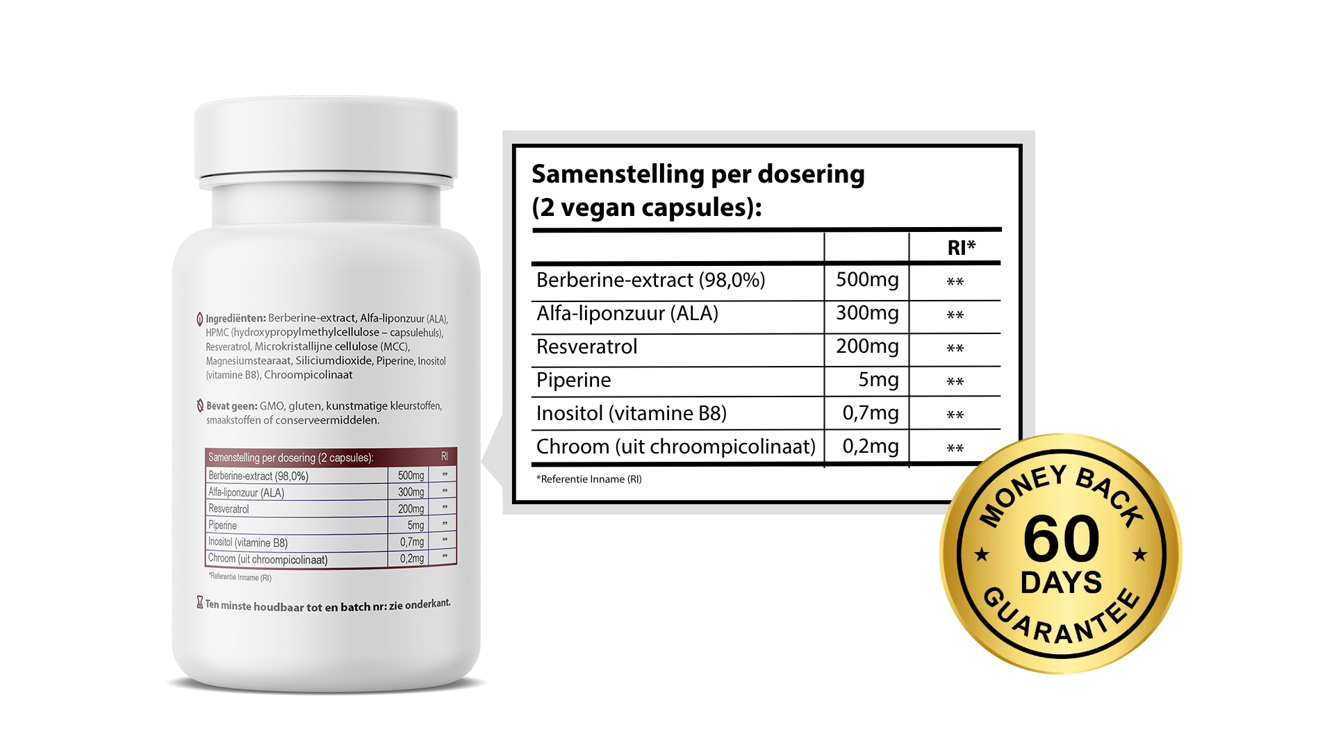 We voegen ook alfa-liponzuur, resveratrol, piperine, inositol en chroom toe voor extra bloedsuikerondersteuning.
