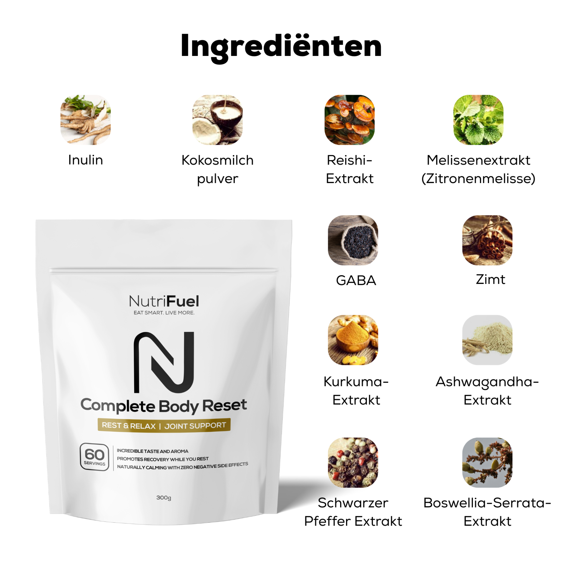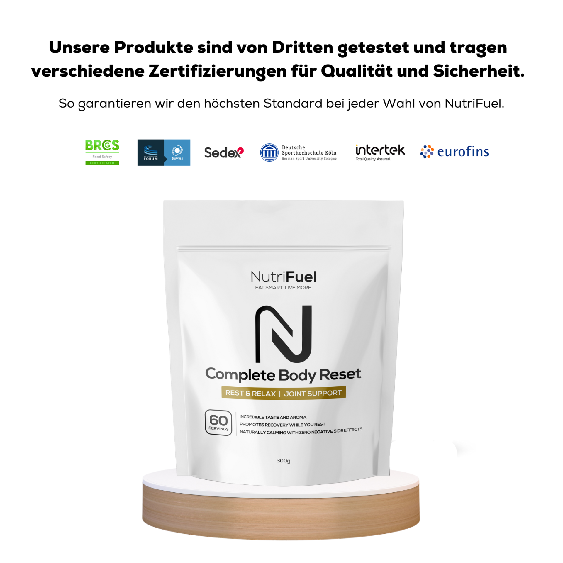 Bei Nutrifuel glauben wir an die Qualität unserer Produkte. Deshalb bieten wir Ihnen bei jedem Kauf eine 60-tägige „Feel-Good“-Garantie an. Das bedeutet, dass Sie volle 60 Tage Zeit haben, Nutrifuel Complete Body Reset auszuprobieren. Und wenn Sie nicht vor Freude sprühen, während sich Ihre Gelenkschmerzen reduzieren … Verdauungsprobleme nachlassen … Sie eine neue, spürbare Energie erleben … und noch vieles mehr … Dann gehen Sie kein Risiko ein.