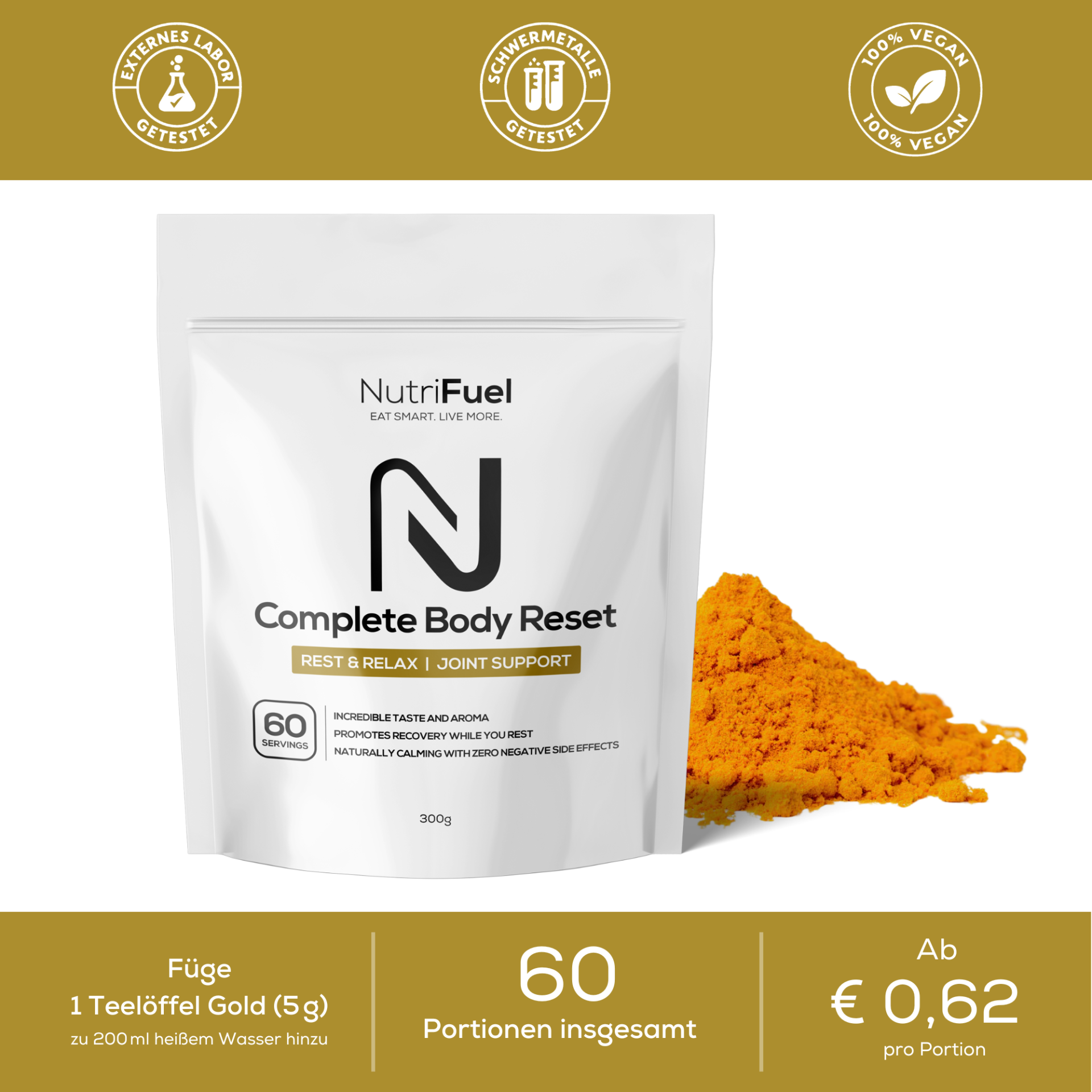 Der Grund ist einfach: Nutrifuel Complete Body Reset verwendet ausschließlich die reinsten und hochwertigsten Quellen von Curcumin mit vollem Wirkungsspektrum sowie Schwarzpfeffer-Extrakt für eine verbesserte Bioverfügbarkeit.