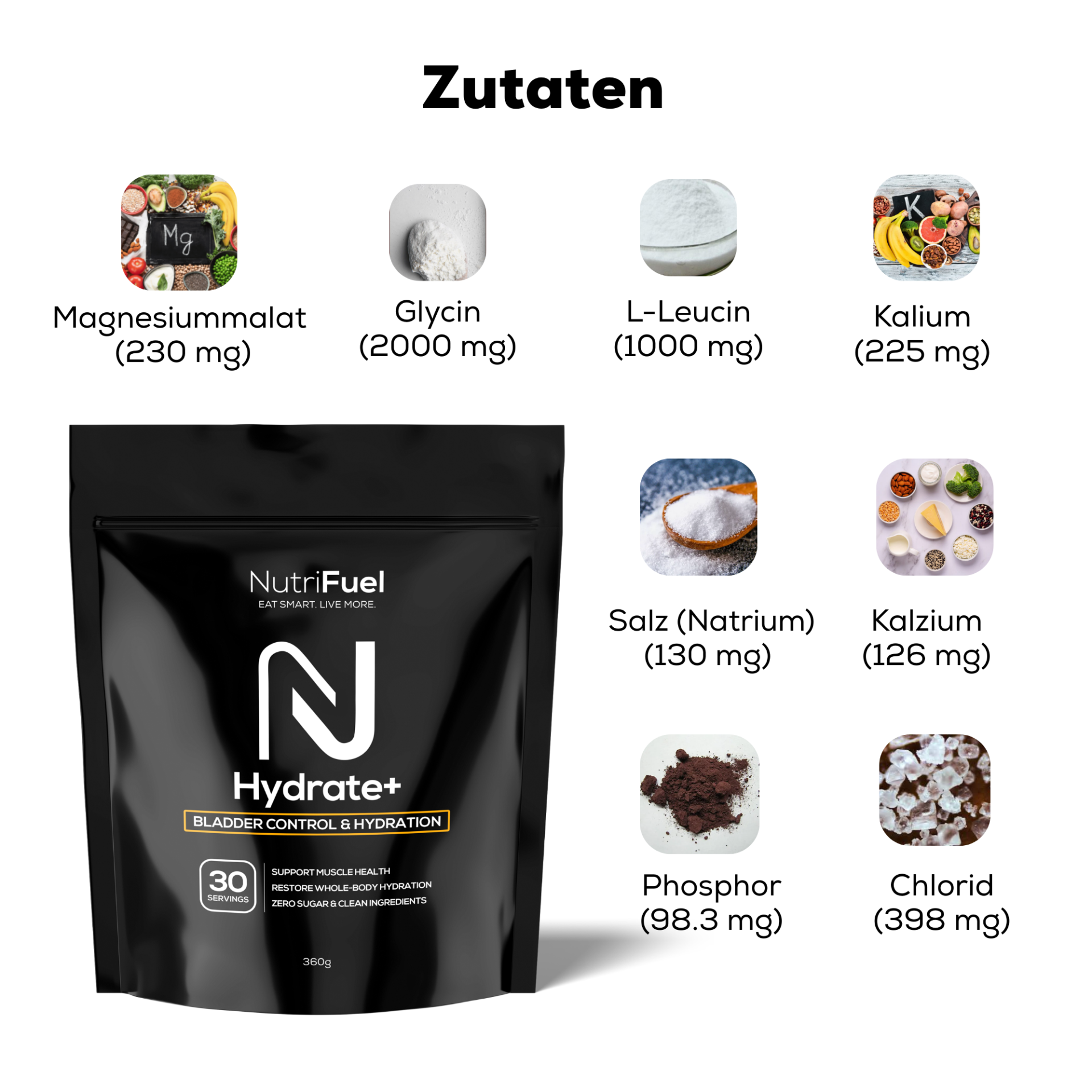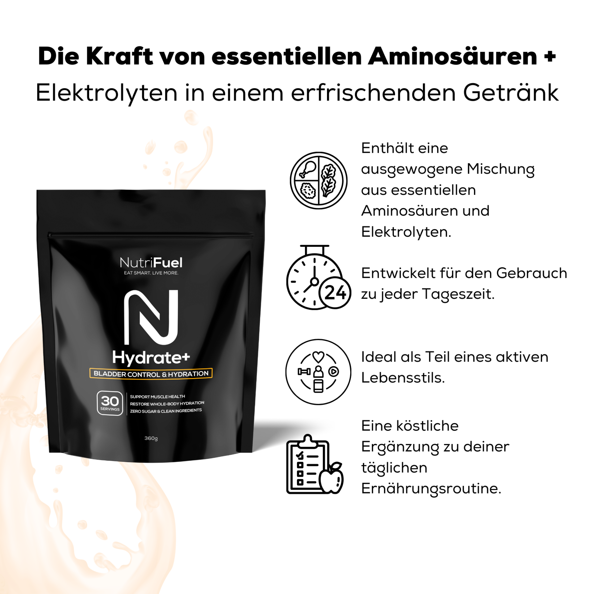 Aminosäuren stärken die Muskel- und Nervenfunktion – einschließlich jener, die für die Blasenkontrolle entscheidend sind – und unterstützen gleichzeitig eine optimale Hydration durch die Wirkung von Elektrolyten.